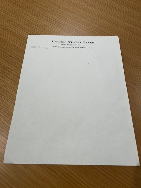 Nice sheet of USL company letter herd for the pier 60 location in NY … also includes the Panama Pacific and American Pioneer Lines .. so I would say this is from the 1930’s. Nice condition w/ minor fold line.