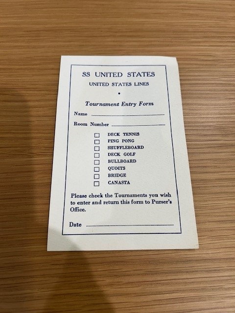 Card games were all the rage on most voyages … and excellent way to pass the time onboard .. sometimes there were even tournaments (and of course betting and gambling). This score pad is like new and unused … the pages have yellowed a bit though. Includes printed Samba and Canasta scoring rules on the covers.