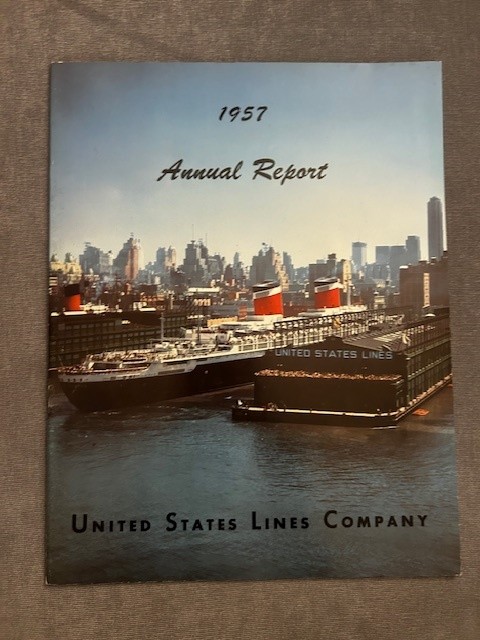 A fantastic AR for USL 1957 … which covers finances, company and fleet information. Excellent sections that summarize the cargo and passenger operations as well as a fairly large section that covers the proposed replacement for the SS America ( which would cost USL approx 47M) Excellent glossy cover Photo of the SSUS at pier 86 with the Ile De France’s funnel peeking over the top of the adjoining pier shed. Excellent like New condition.