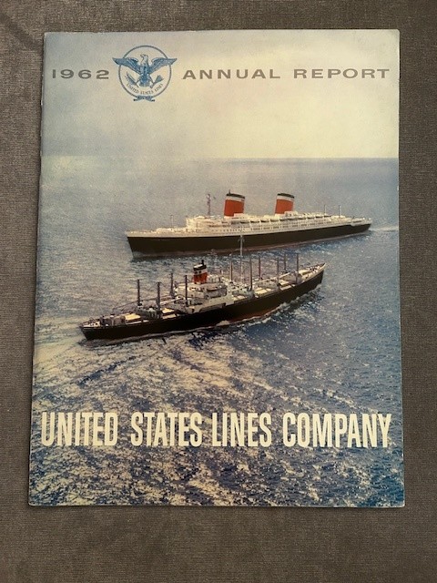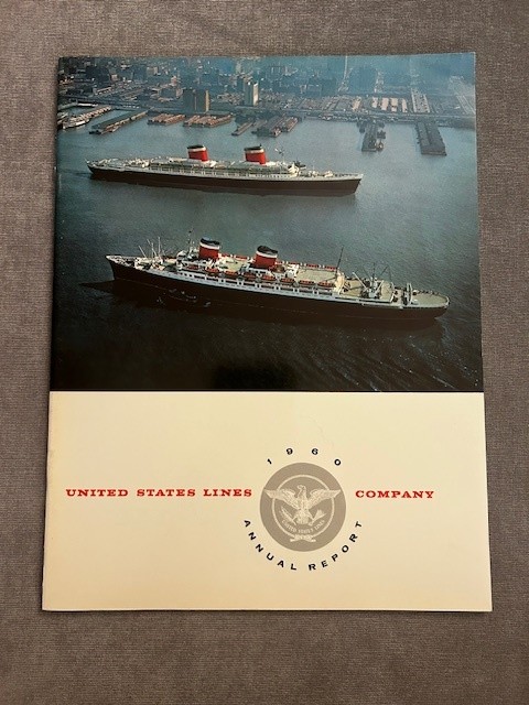 A super AR for USL 1960 … which covers finances, company and fleet information. Excellent sections that summarize the cargo and passenger operations the passenger section occupies a full 2 pages with some photos and a small rendering . Other pages also have nice photos and renderings of vessels in the fleet. Excellent glossy cover Photo of the SSUS and American passing in the Hudson. Excellent like New condition.