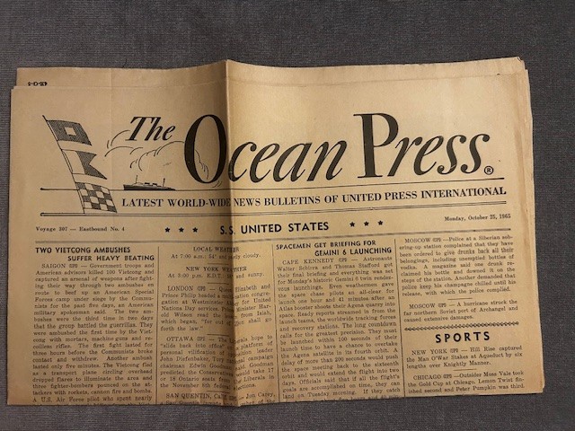 Nice copy (though it has been folded) printed on 10/25/65 … voyage 304 #4. New coverage… including some coverage of the Viet Nam war and the Gemini 6 launch. Also has a blank crossword puzzle (with answer key on the last page). Includes weather, sports and advertisements. 8 complete pages.