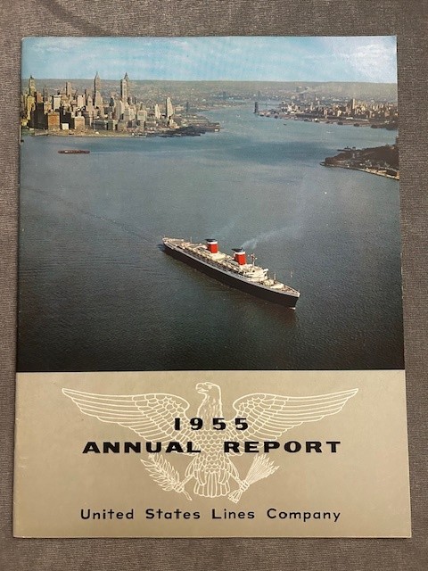 Just a fantastic AR for USL 1955 … which covers finances, company and fleet information. Excellent sections that summarize the cargo and passenger operations. Excellent glossy cover Photos of the SSUS heading out of NY Harbor, with light wisps of smoke flowing from her funnels. Excellent like New condition.