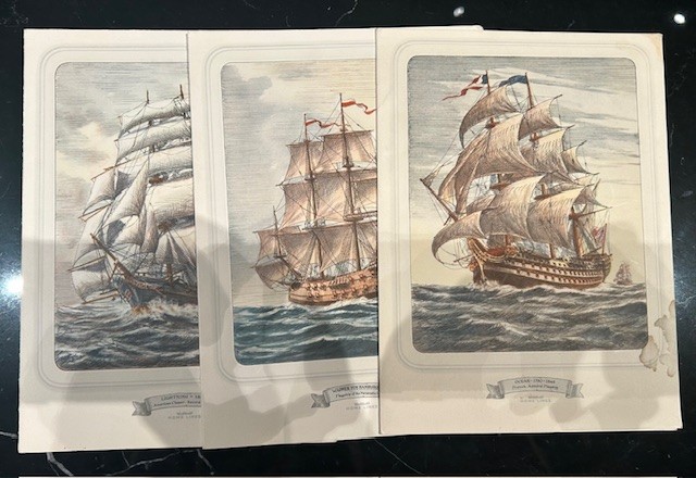 3 lovely sailing ship menus (2 dinner, 1 luncheon) all dated 6/27/54. One has what appears to be some wine stains … right off the diner table! the ship images are the Lightning 1854, the Ocean 1790-1840 and the Wappen Von Hamburg 1720. Suitable for Framing. (sorry for the shadowy photos).