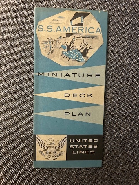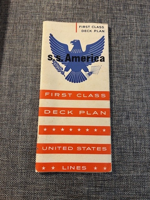Super cool CC plan for the America … dates to the late 40’s early 50’s before the SSUS joined the fleet. nice color coded deck plans with good b/w photography of cabin and public spaces. Excellent color Starboard profile of the ship showing top to bottom deck names. Very good conditions with tiny bits of edge and foldline wear.