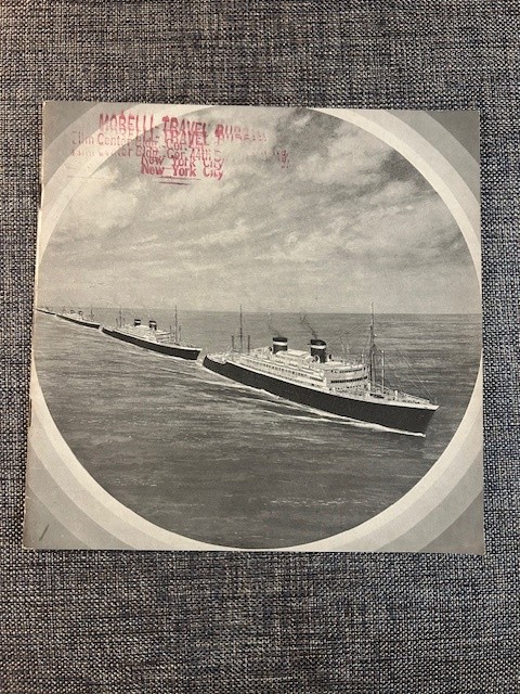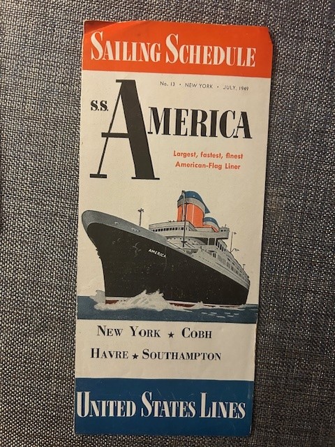 Nice SS America sailing schedule 3 panel flyer from July 1949 … for the 49-50 season. Small wrinkle to the upper left hand corner..