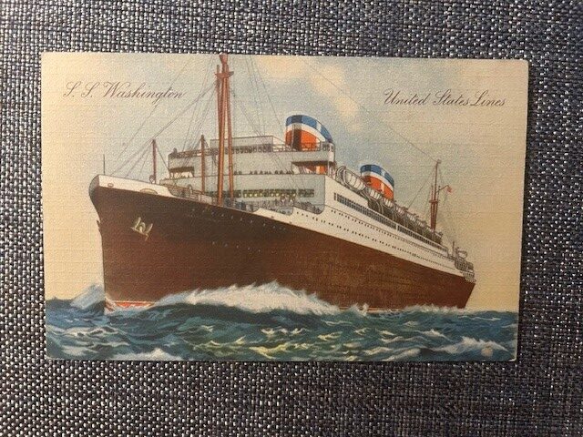 A Lovely linen PC for the Washington. The text on the back mentions the America coming into service in 1940 .. so this dates for the very late 1930’s. Good condition.